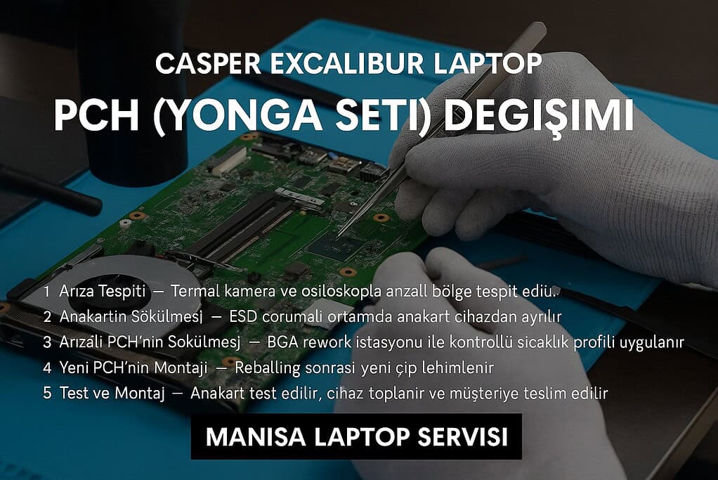 Manisa Laptop Servisi olarak, Casper Excalibur serisi laptoplarda karşılaşılan PCH (Platform Controller Hub) arızalarını profesyonel teknik ekibimizle onarıyoruz. PCH çipi, anakartın en kritik parçalarından biridir ve arızalandığında cihazınız açılmayabilir, donma veya beklenmedik kapanma sorunları yaşanabilir.